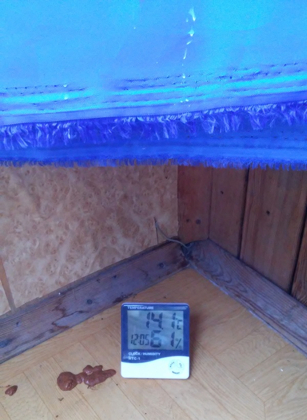 Когда не хватало влажности, ставил миску с водичкой и опрыскивал стенки и пол из пульвера. Температура колебалась от 13 до 17 С, влажность иногда падала до 40%, ночь после дождя из за открытого окна прыгала до 80%.