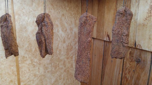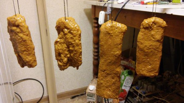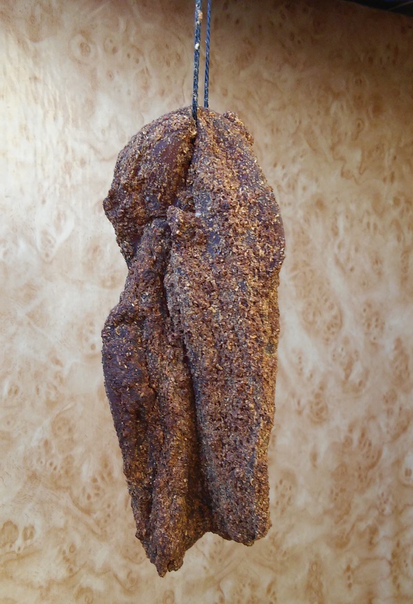 Вялил я ее 8 дней. На третий день мясо было еще мягкое, на пятый день, как я понимаю, можно было снимать, но поскольку я боялся травануться, то ждал еще 3 дня. Время выдержки индивидуально, мните продукт в процессе дозревания и определяйте нужную Вам жесткость.