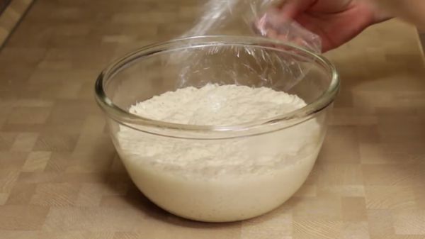 Остаток муки смешать с растворимыми дрожжами и тоже добавить в воду.