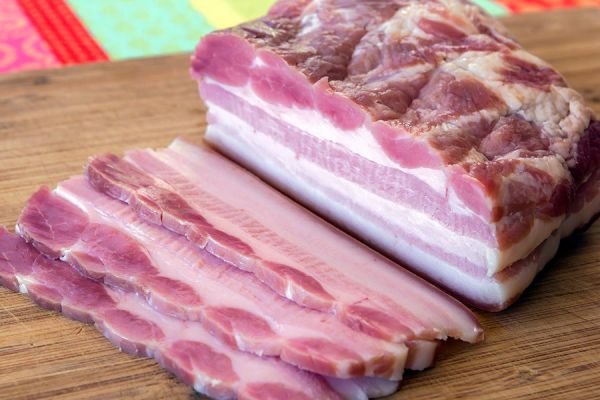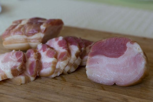 Бекон: эта партия (третья уже на моём пути изготовителя бекона) нравится меньше предыдущей. Предыдущую солил сухим способом, варил так же, коптил холодным дымом.