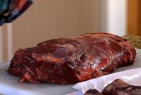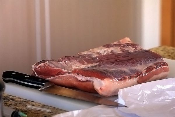 После чего вытащил, ополоснул под струёй воды, и оставил в прохладной воде (14-18 градусов) на 30 минут на вымачивание. Вышеуказанный документ сообщает, что за время посола концентрация соли в наружных слоях поднимается в два-три раза выше, нежели внутри кусков. Для меня это звучит странно, т.к. шприцевание из расчета 20% рассола в куске, на мой взгляд, должно привести к почти абсолютной равномерности посола, но кто я такой чтобы спорить с технологами (пусть даже безвестными)?