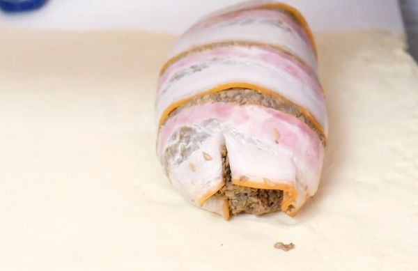 Слоеное тесто раскатываем в пласт. Рулет освобождаем аккуратно от пищевой пленки и перекладываем на тесто, края теста смазываем яичным желтком. Заворачиваем рулет в тесто, лишнее тесто обрезаем.