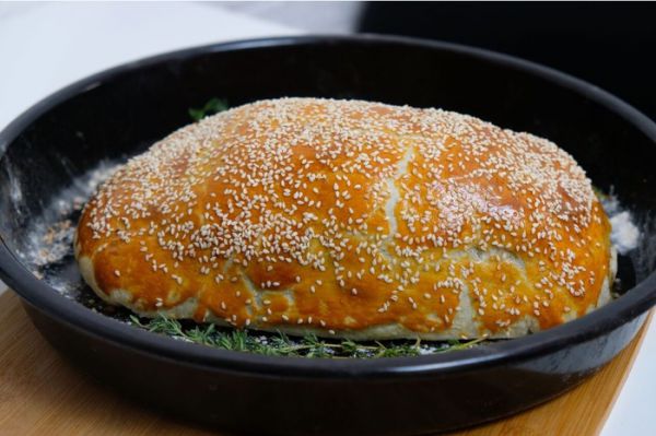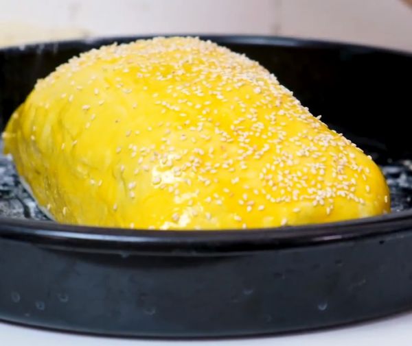 Сверху тесто смазываем яичным желтком и посыпаем кунжутом.