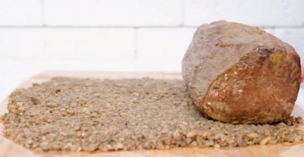 На пищевую пленку выкладываем полоски бекона, сверху дюксель. Перекладываем мясо на грибы и при помощи пищевой пленки заворачиваем вырезку.