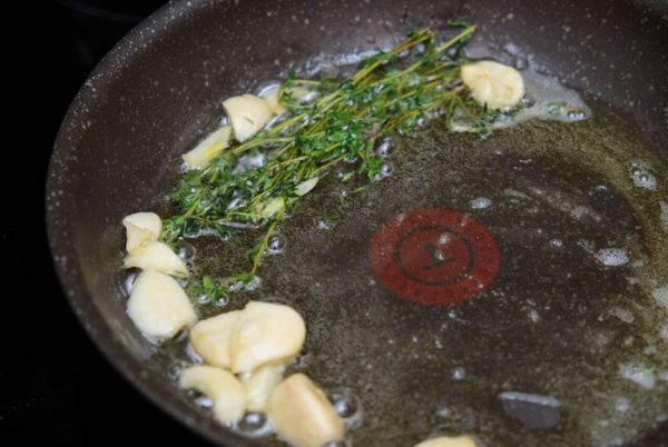 На смеси растительного и сливочного масел обжарить чеснок и тимьян, чтобы масло стало ароматным. Следите, чтобы тимьян и чеснок не подгорели, сразу же снимайте их со сковороды при первых признаках подгорания.