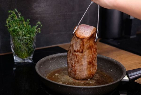 Говядину запечатать со всех сторон и с торцов тоже, обжаривая до румяной корочки минуту-полторы с каждой стороны. На этом этапе нам нужно задать корочку и запечатать все соки внутри мяса, внутри оно остается еще сырым и будет еще запекаться в духовке.
