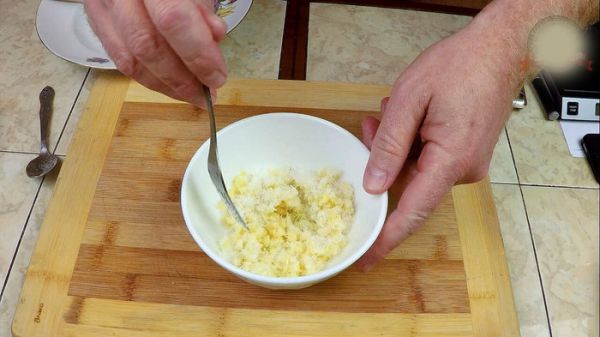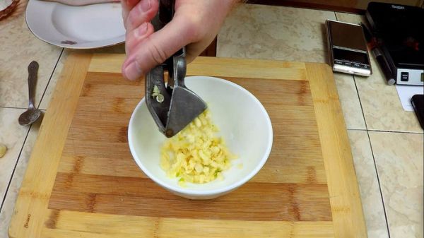 Головку чеснока очищаю на дольки и давлю прессом. Смешиваю чеснок с солью.
