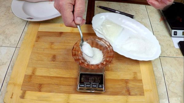 Для второго куска сала (для копчения) весом 1кг 214 граммов составляю смесь солей 2,5% от веса сала. Это нитритную и поваренную крупную (морскую) соль – весом 31 грамм в равных долях соли (15,5+15,5 граммов). Смешиваю и втираю соль в кусок сала.