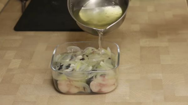 Аккуратно уложить в посуду кусочки рыбы, чтобы она вся была покрыта маринадом.