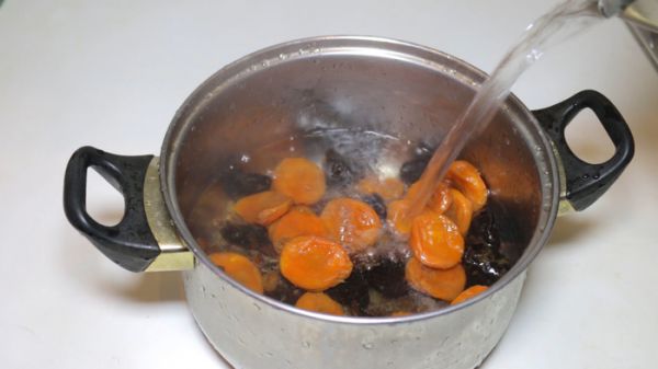 В начале приготовления необходимо пересыпать в небольшую кастрюльку изюм, чернослив и курагу. Промываем сухофрукты в холодной воде. Заливаем их кипятком и оставляем. Мы вернемся к ним чуть позже.