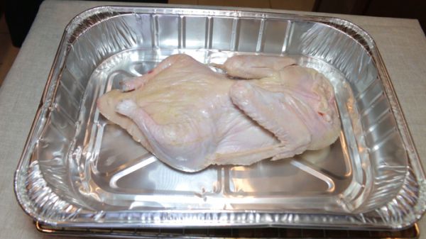 В центр противня для духовки (я использую одноразовый) помещаем утку. Обращаю ваше внимание на то, что первые 40 минут утка будет готовиться на животе, чтобы она лучше пропеклась и только потом я её переверну.