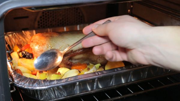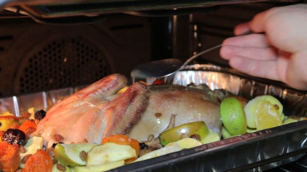 В таком виде отправляем утку в духовку, заранее разогретую до 180 градусов. Каждые 20 минут утку необходимо поливать соками со дна подноса.