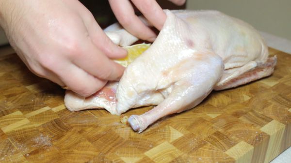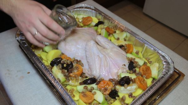 Берем утку. Первым делом её необходимо натереть солью. Делаем это со всех сторон. А так же важно натереть её изнутри. Самое время вспомнить о сухофруктах, которые до этого мы заливали кипятком. Теперь их надо поместить внутрь утки. Набиваем их максимально плотно. А так же не забываем про дольки апельсина и яблоки.