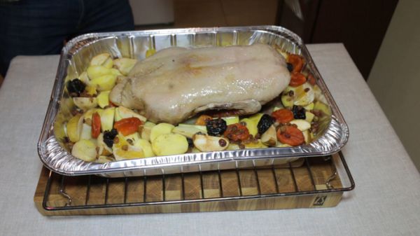 Через 40 минут достаем утку из духовки. Переворачиваем её на спину. Следим за тем, чтобы овощи и фрукты были равномерно распределены по противню. Отправляем утку обратно в духовку на ту же температуру 180 градусов.