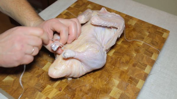 В ушко большой иголки просовываем кулинарную нить. Зашиваем утке отверстие в животе, чтобы фрукты внутри неё томились в утином жире и одаряли утку фруктовыми ароматами, без возможности вывалиться из неё наружу. Переворачиваем утку и связываем ей за спиной крылья и лапы. Я делаю это той же самой кулинарной нитью. Лишние нитки необходимо обрезать, чтобы в дальнейшем они не мешались.
