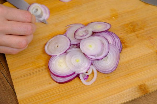 Лук нарежем тонкими кольцами и тоже замаринуем, добавив уксус, сахар, соль и 50 мл кипятка.