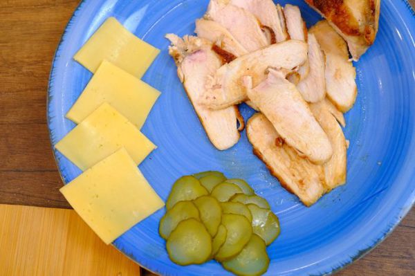 Куриное филе обжариваем до готовности и нарезаем тонкими полосками. Тонкими кольцами нарезать огурец и небольшими ломтиками – сыр.