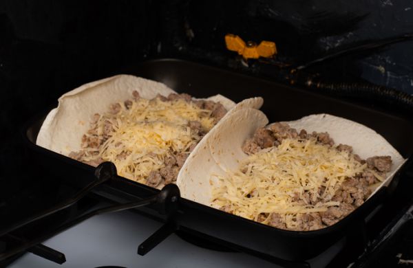 Почти сразу кладём лепёшки на сковороду. Вот примерно таким способом. Здесь мы готовимся уложить очень, очень много начинки. Потому закрывать полностью лепёшки мы не будем.