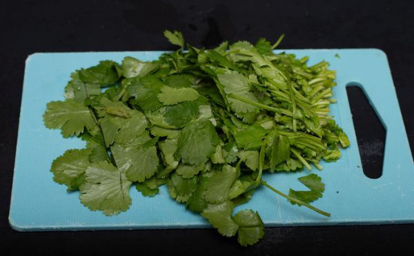 Осталось нарубить нашу слегка... Да, слегка пожухшую кинзу.