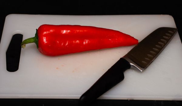 И наконец нарежем перец. Здесь мы используем болгарский перец, совершенно не острый, абсолютный нуль по Сковиллу, чтобы впоследствии иметь возможность дозировать остроту соусом - какие-то тако будут острыми. какие-то нет. Вы вольны заменить часть перца на более острые сорта, в зависимости от того, насколько силён в вас дух Мексики.