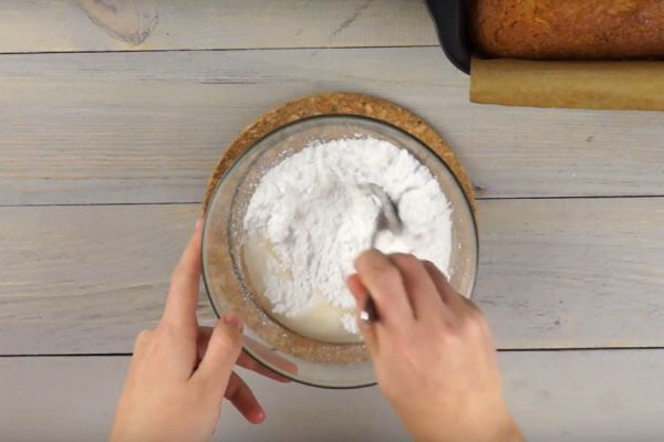Для глазури смешиваем 200 грамм сахарной пудры, 2 столовые ложки лимонного сока и 3 столовые ложки воды.