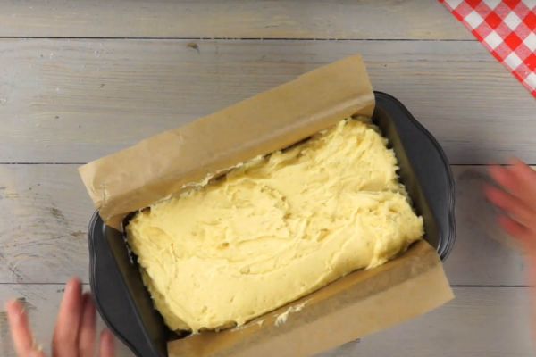 Выкладываем тесто в форму 15х29 см, которую можно застелить пергаментом, чтобы легче извлечь готовый кекс.