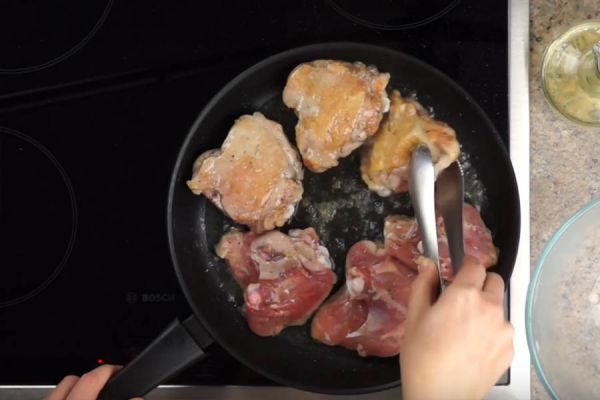 Куриные крылья посолить, поперчить и обжарить на сковороде 7-8 минут с каждой стороны.