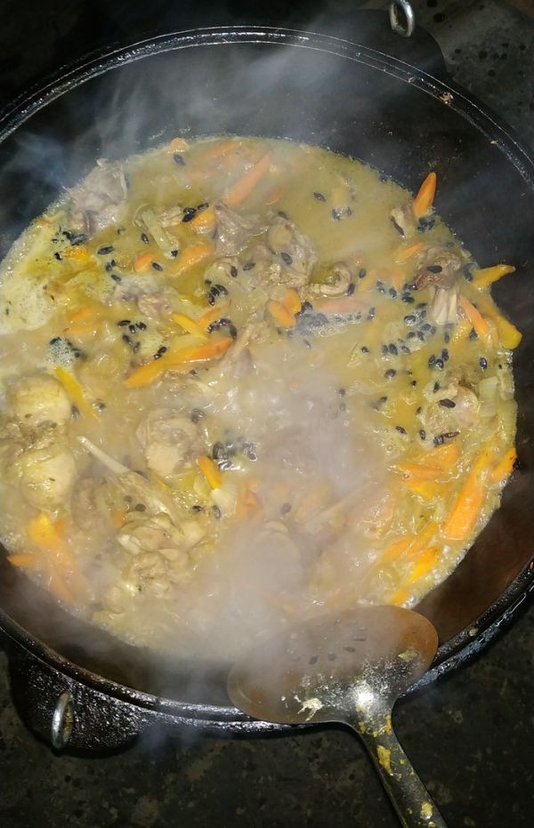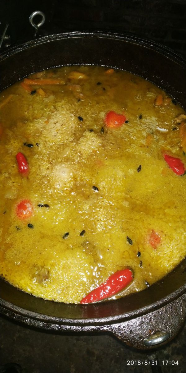 Немного обжариваем все вместе, добавляем зиру, барбарис, перец и куркуму. Заливаем водой...