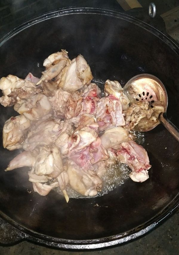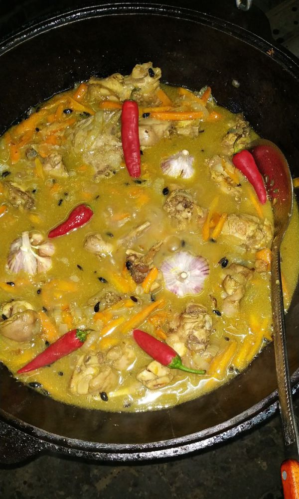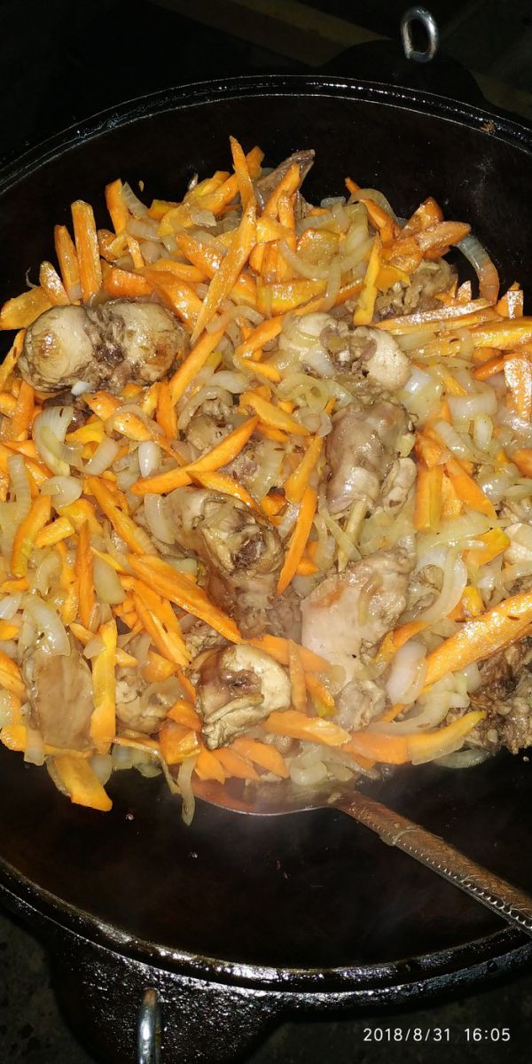 Далее идут чили перец, чеснок. Тушим "Зирвак" (вроде так по узбекский называется) 30-40 минут.