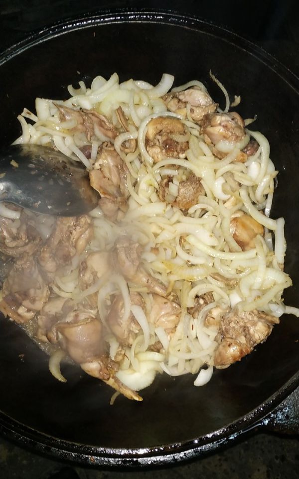 К мясу добавляем лук и жарим дальше. Солить надо мясо с луком. Говорят так вкуснее...