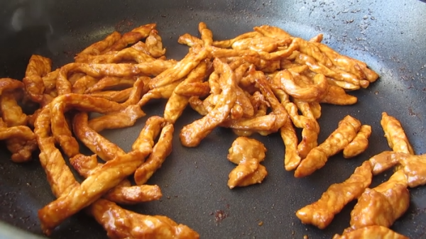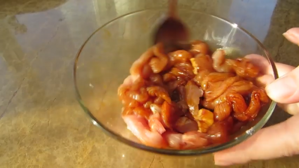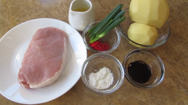 Мясо ( у меня постный кусочек свинины) нарезаем тонкими полосками. Добавляем крахмал, соевый соус, перемешиваем и даем промариноваться минут 20.