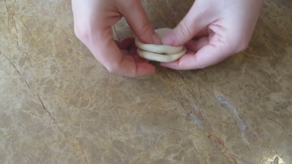 Тесто делим на небольшие заготовки, желательно одинаковые (мои по 20 гр). Руками делаем небольшие лепешечки и соединяем по две, между ними промажем растительным маслом.