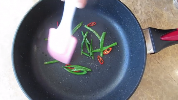 После картофеля, в остатках масла прогреем зеленый лук и острый перец (колечками), секунд 30. Смешиваем с картофелем.