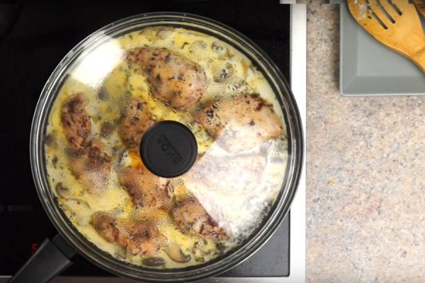 Добавить бульон (или воду) и сливки любой жирности. Немного посолить и поперчить и добавить травы. Сюда же ранее обжаренное куриное филе и тушить все это 15 минут. Пока это все тушиться сварить макароны. Добавить их в сковороду хорошо перемешать и подавать к столу.