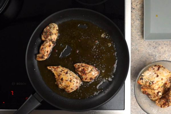 Обжарить на сковороде 3-4 минуты с каждой стороны. Отложить филе в отдельную миску.