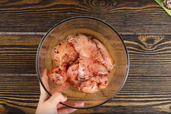 Курине филе нарезать кусочками, посолить, поперчить, добавить паприку, прованские травы и масло подсолнечное - 2-3 ст.л. Хорошо все перемешать.