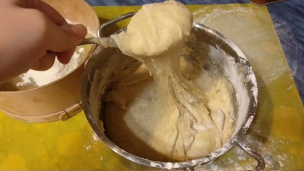 И начинаем вводить муку, предварительно её просеивая. Тесто для того чтобы можно было его катать должно иметь консистенцию как на видео.