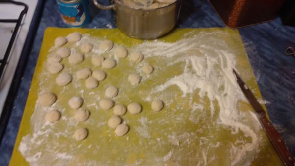 После насыпаешь на стол и на руки муку и начинаем катать колбаску на столе. После режим её на куски и какие шарики.