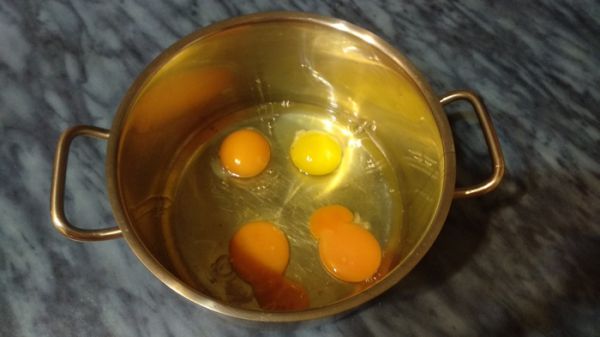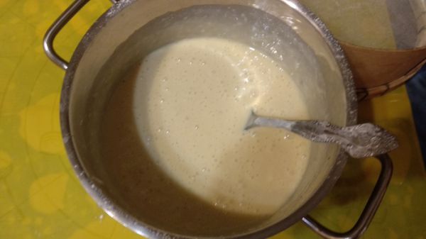 Яйцо смешивается с сгущенкой до состояния однородной массы, потом добавляется сода.