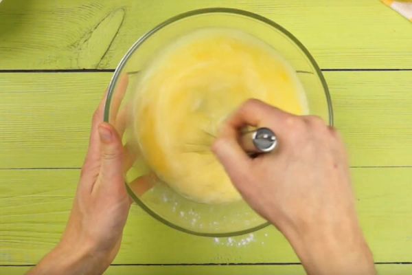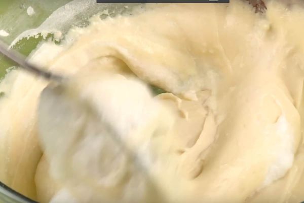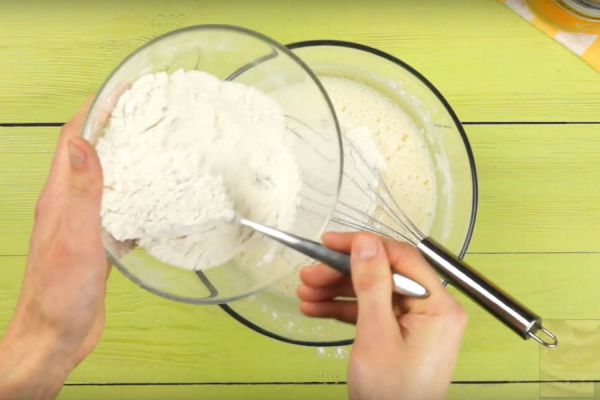 Добавьте в получившуюся массу в несколько заходов сухие ингредиенты (муку и разрыхлитель), который мешали в шаге 1.