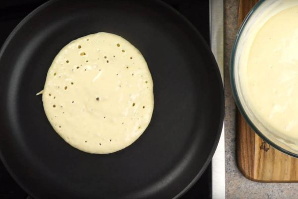 На один панкейк уходит примерно 2.5-3 столовые ложки теста. Жарить их нужно по 1-2 минуты с каждой стороне на средне-слабом огне.