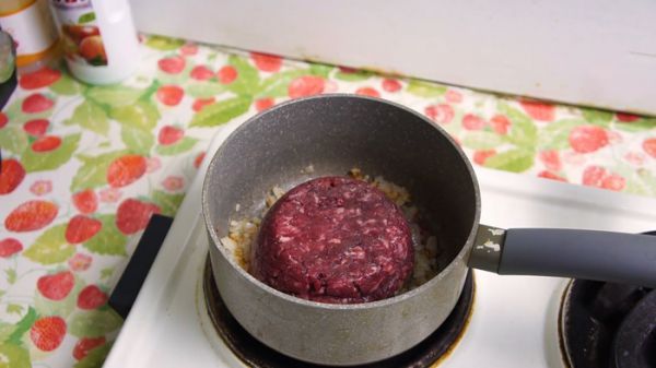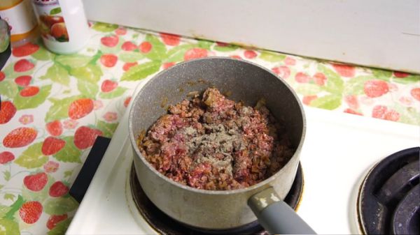 Добавляем к ним говяжий фарш, 1/2 ложки паприки, 1 щепотку молотого тмина, и обжариваем все это до слегка золотистой корочки фарша