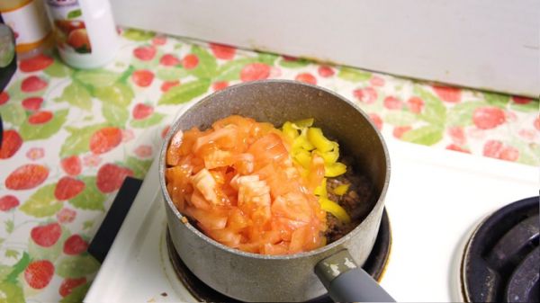 Фарш обжарился, добавляем овощи - перец и помидоры (мы купили сразу очищенные, однако вы можете легко очистить их сами - опускаете в кипяток, ждете минуту, делаете надрезы на кожуре и легко снимаете ее)
