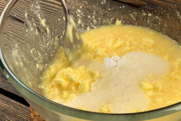 После этого добавим сливочное масло нарезанное на кусочки и опять перемешаем. После чего добавим соду и лимонный сок и пять хорошенько перемешаем.