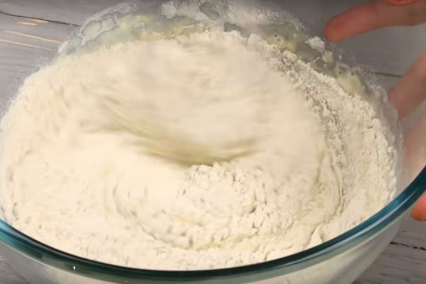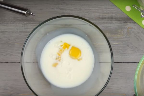 В 2-3 подхода в смесь с молоком и яйцами, добавляем сухую смесь. Хорошо перемешиваем и отставляем в сторону.