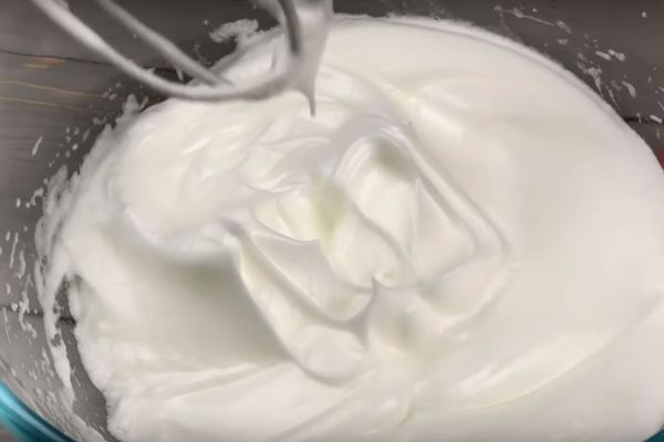 Взбиваем белки с щепоткой соли до состояния пены, а также постепенно добавляем 25 грамм сахара, взбиваем до очень густой массы, похоже на бизе или меренги.