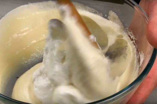 Замешиваем тесто аккуратно вводим взбитые белки по принципе переворачивания листов книги.