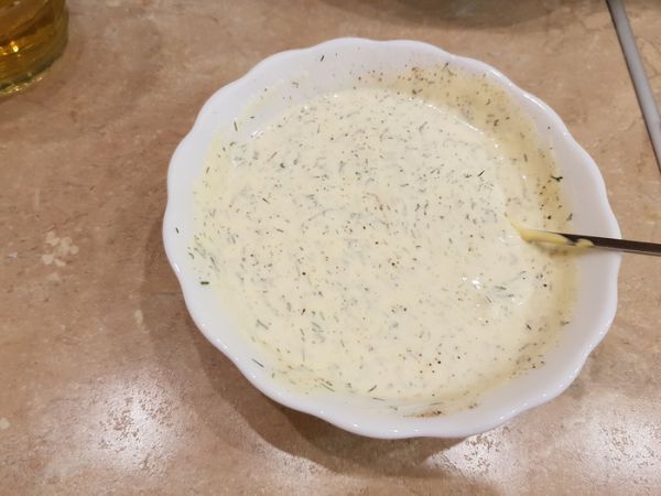 Для соуса в отдельной чашке соединяем йогурт и майонез, нашинкованный укроп, мелко нарезанный или натертый чеснок (либо используем чеснокодавку), черный перец, сок лимона, хорошо перемешиваем. Соус должен быть чуть гуще магазинной 15% сметаны.