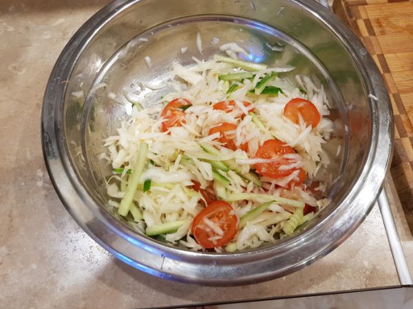 В отдельную тарелку шинкуем капусту, добавляем немного сахара, соли, хорошенько отжимаем ее и добавляем примерно 1 ст.л. яблочного уксуса, туда же добавляем нашинкованный полукольцами лук. Даем постоять минут 30, затем в эту же тарелку добавляем нашинкованный соломкой свежий огурец и кольцами (если черри) помидоры.