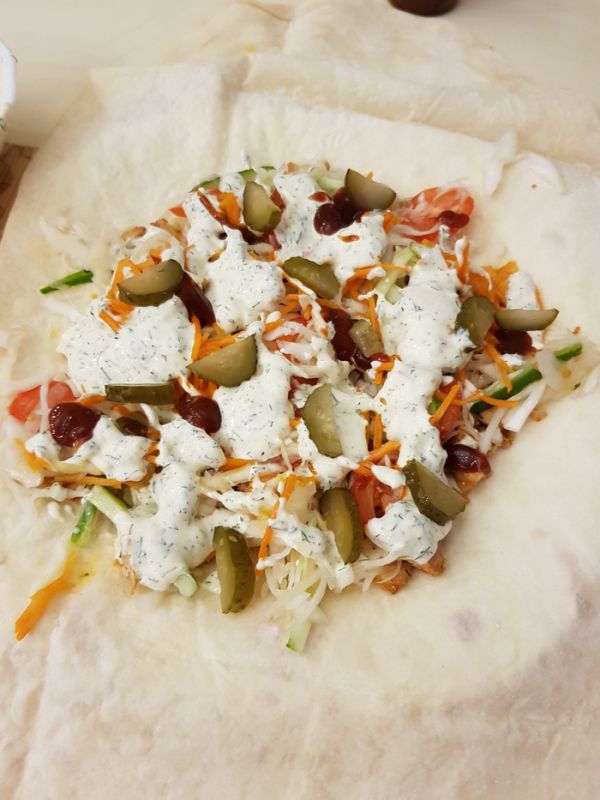 Слои: лаваш, курица, часть соуса, салат (капуста, морковь, огурец, лук), соус, морковь по-корейски, соленый огурчик, любимые вами томатные соусы ( для остроты и пикантности добавлял тобаско и bbq который на фото в самом начале).